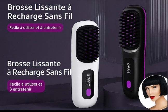 Brosse lissante sans fil avec ions négatifs. Chauffe ultra-rapide, portable, protège vos cheveux. Le lissage professionnel devient mobile.